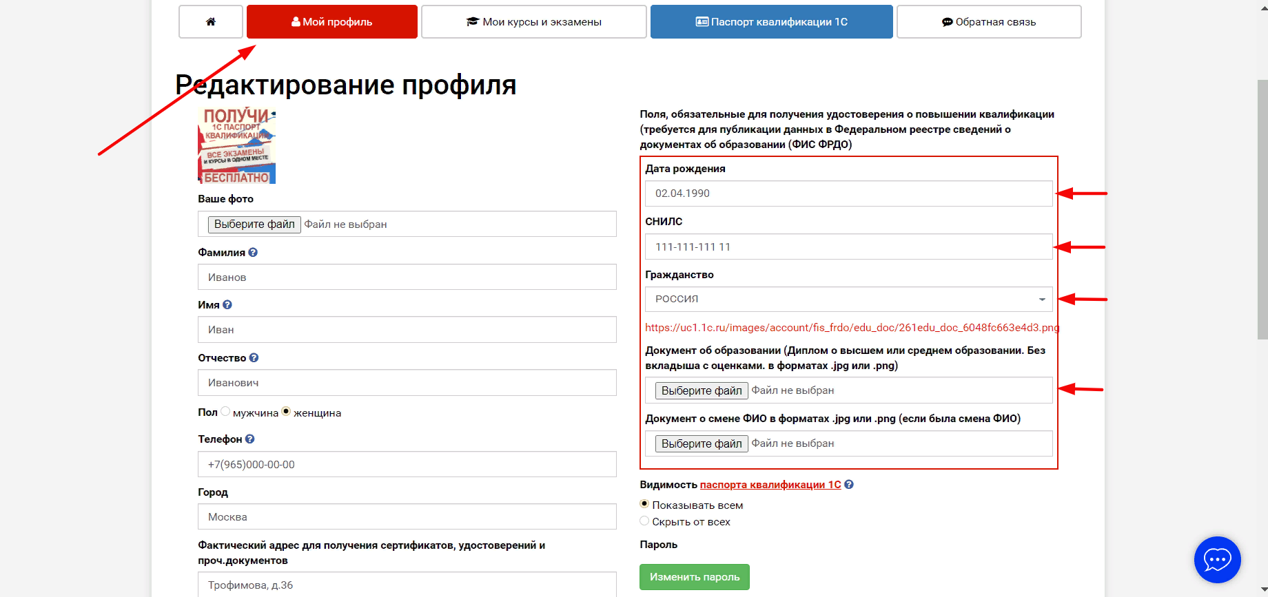 Далее, в окне «Получение паспорта квалификации 1С» необходимо заполнить личную информацию и нажать на кнопку Получить