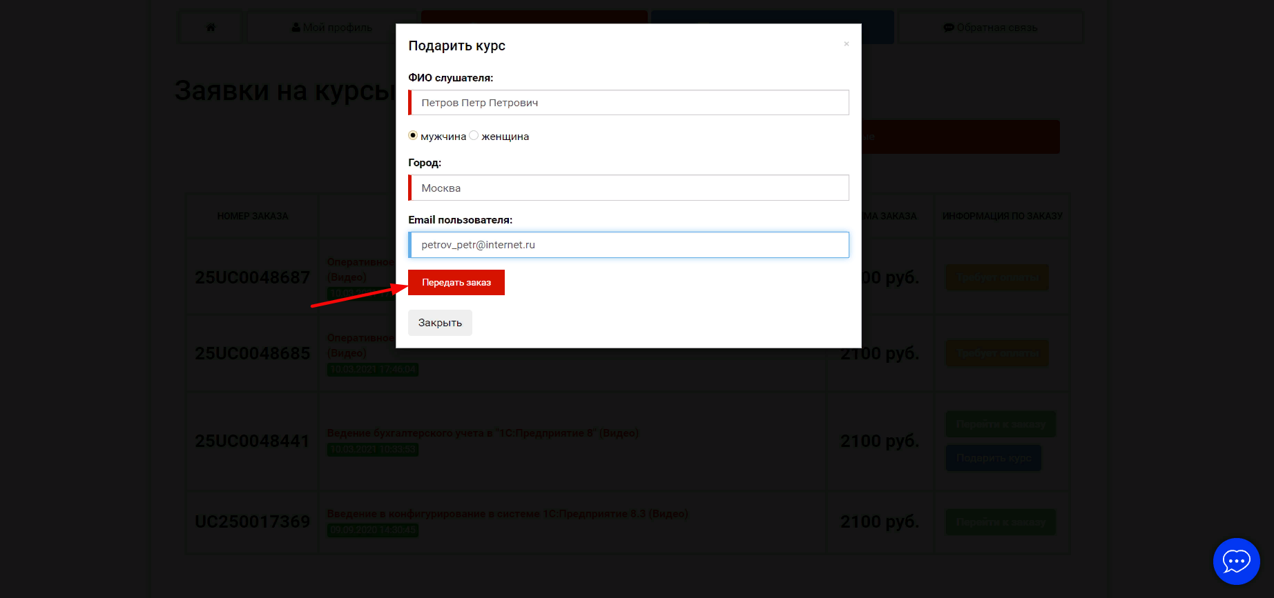 2. В окне "Подарить курс" - необходимо заполнить данные того человека, которому вы передаете заявку на курс
