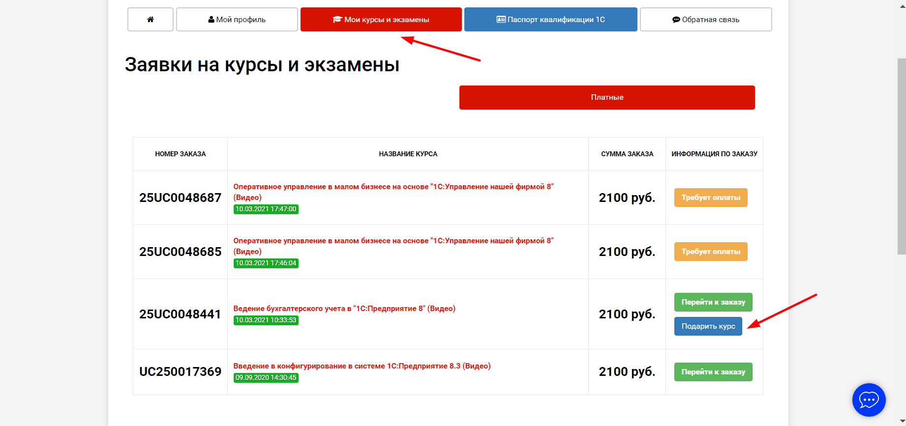 1. Перейти в раздел личного кабинета - Мои курсы и экзамены. Около заявки на курс нажать на кнопку Подарить курс